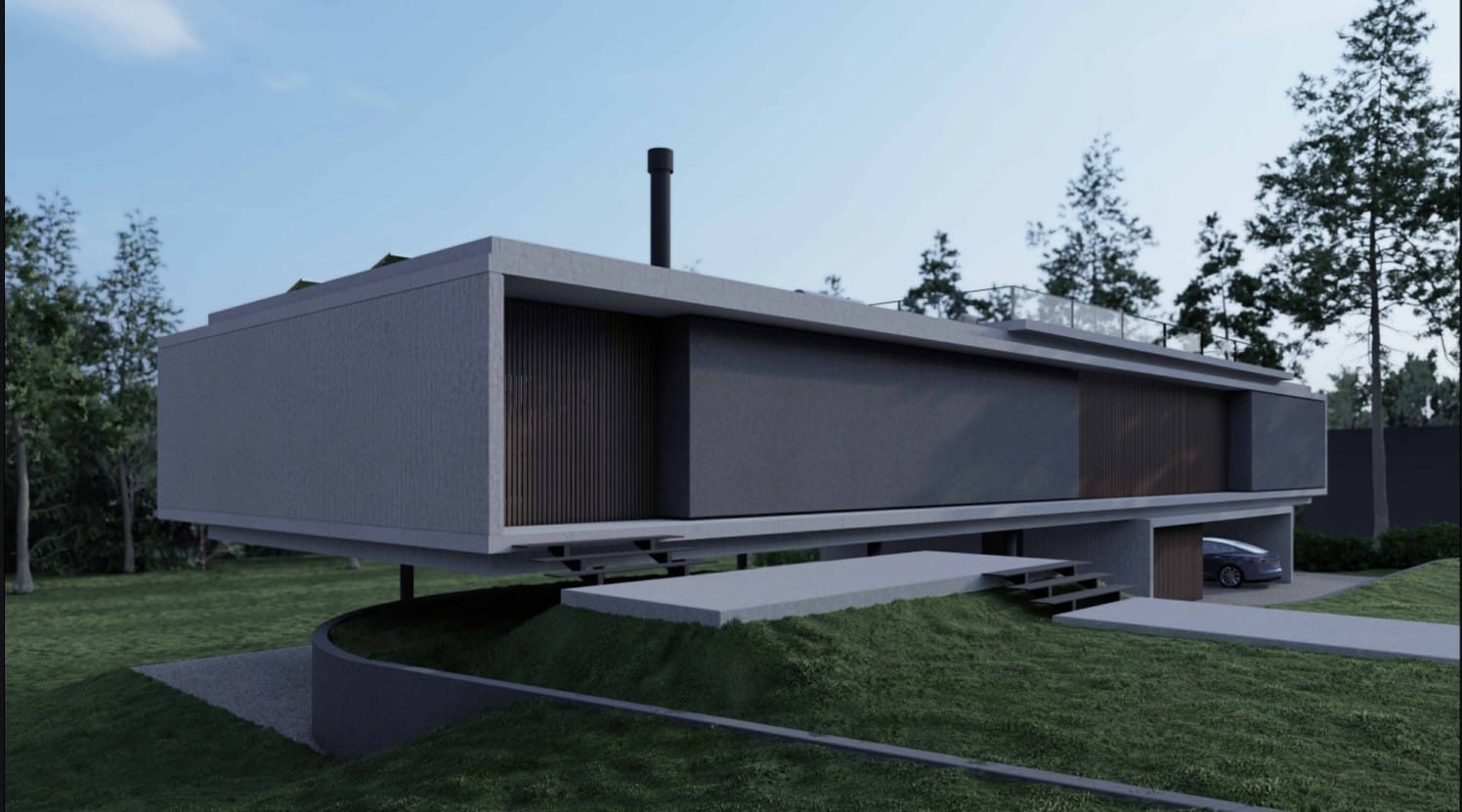 Realizada en colaboración con el Arq. Juan Manuel Méndez. El encargo consistió en el desarrollo de un anteproyecto para una vivienda contemporánea que respondiera a un programa funcional específico: tres dormitorios en suite, living, cocina, comedor y parrillero integrados, junto a un amplio espacio cubierto para estacionamiento. El diseño priorizó la apertura hacia el fondo del terreno, aprovechando su orientación norte y las visuales privilegiadas generadas por el relieve natural del lote. La propuesta buscó maximizar la relación interior-exterior y ofrecer una experiencia espacial fluida, luminosa y en contacto con el entorno.